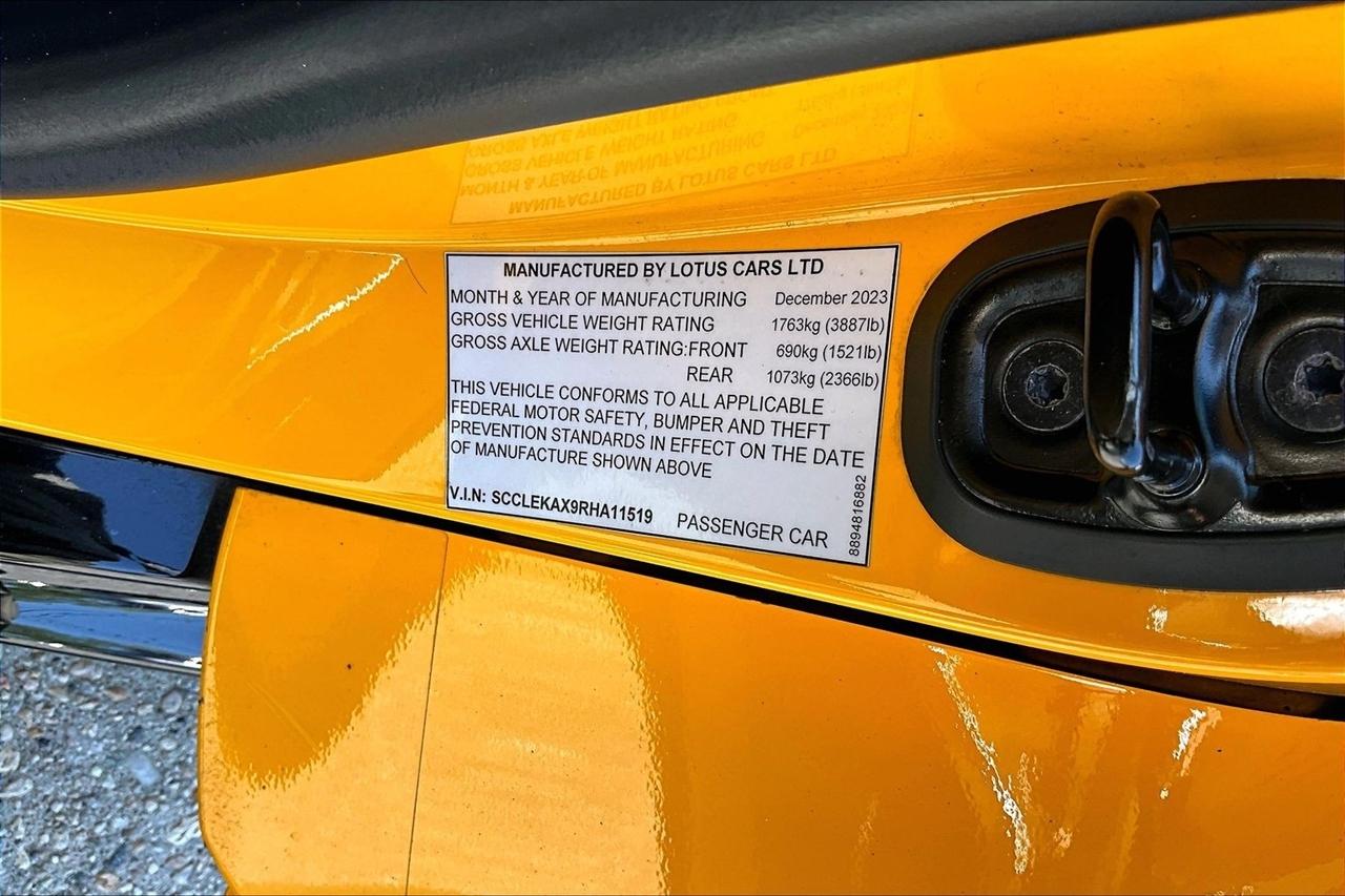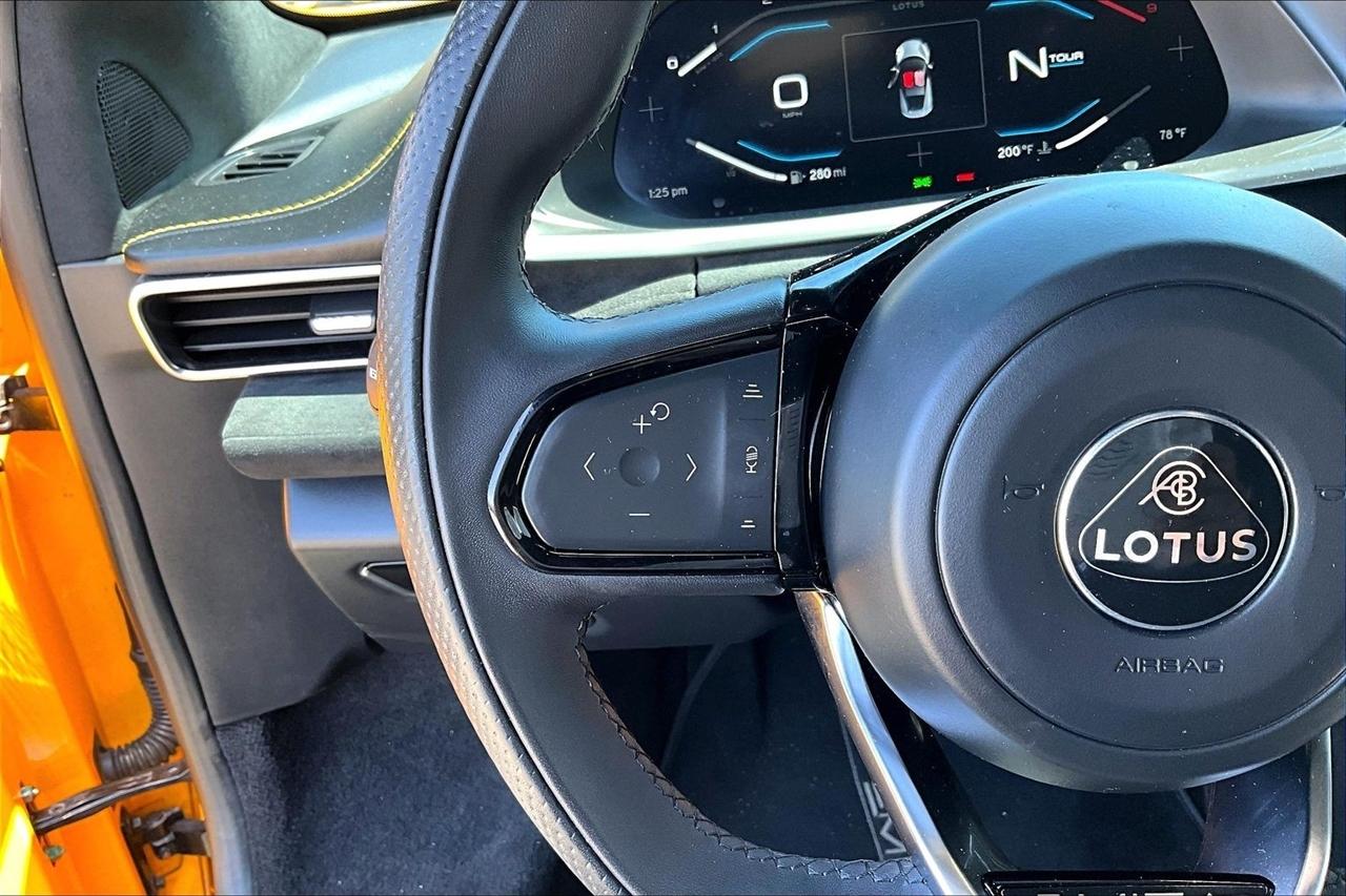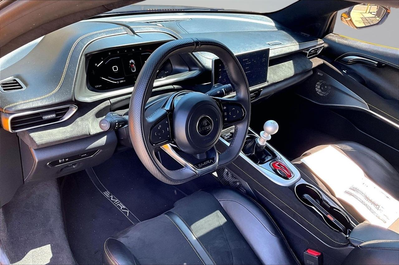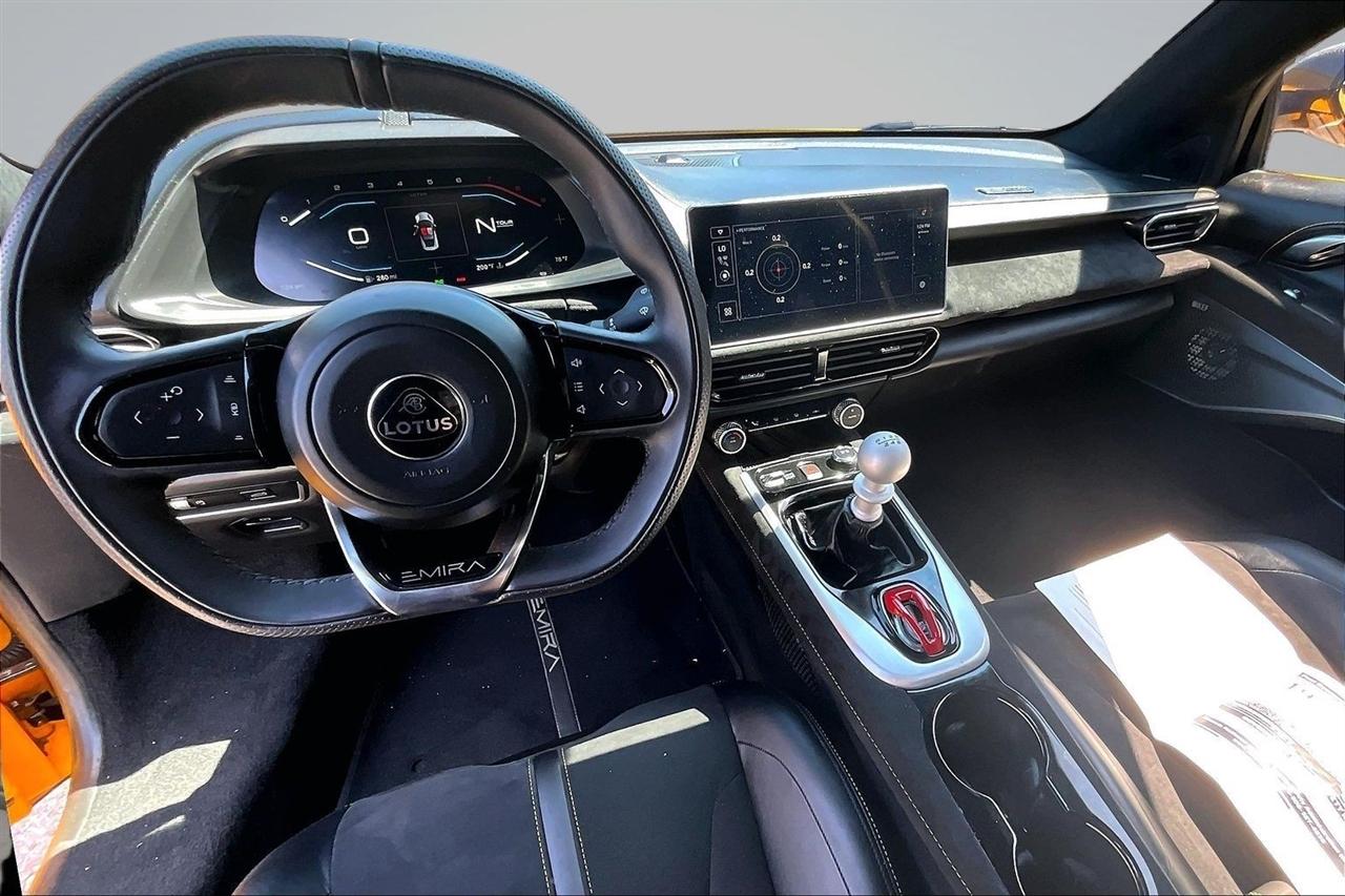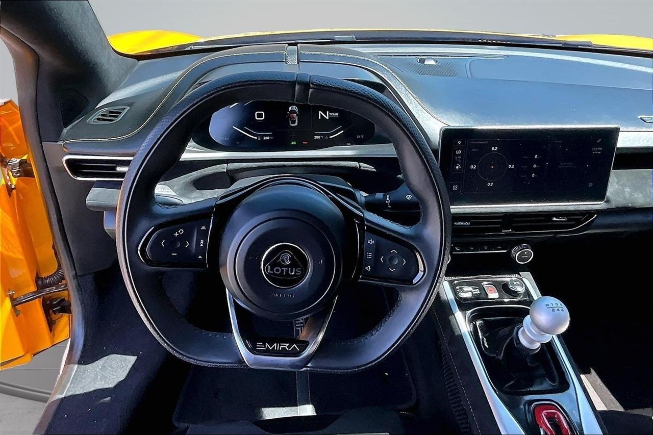 Get ready for a thrilling ride in this sunshine yellow 2024 Lotus Emira! Slip into the luxurious leather seats and feel the warmth of the heated passenger and driver seats as you prepare to hit the road. With dual A/C zones and automatic climate control, you'll stay cool and comfortable no matter the weather outside.Cruise with confidence knowing you have a backup camera, front and rear parking sensors, and blind spot sensor alerts to keep you safe on the road. The LED headlights, daytime running lights, and rain sensing wipers ensure optimal visibility in any conditions.